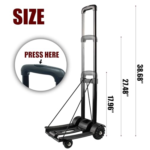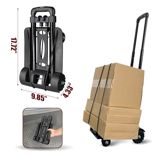 - ♥ Foldable for Easy Storage --- The folding hand truck folded size is: 17.72" x 9.85" x 4.33". The weight is about 4.41 lbs. You can easily fold the hand cart in a few seconds. When not in use, the hand cart can be fully folded up flat and placed in a car, under a bed, storage room, in the gap of the cabinet, etc. It is very easy to store and transport without feeling heavy.