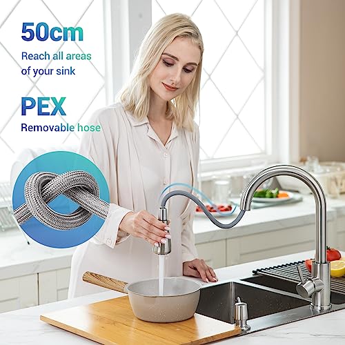 • 𝗧𝗵𝗲 𝗕𝗲𝘀𝘁 𝗣𝗮𝗿𝘁𝗻𝗲𝗿 𝗳𝗼𝗿 𝗬𝗼𝘂𝗿 𝗞𝗶𝘁𝗰𝗵𝗲𝗻 -- Kitchen taps mixer with 50cm pull out hose, can reach even deep corner for cleaning. 360°rotation spout and swivel nozzle offer full range washing access. APPASO kitchen taps bring more convenience during your everyday kitchen tasks!