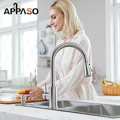 - 𝗧𝗵𝗲 𝗕𝗲𝘀𝘁 𝗣𝗮𝗿𝘁𝗻𝗲𝗿 𝗳𝗼𝗿 𝗬𝗼𝘂𝗿 𝗞𝗶𝘁𝗰𝗵𝗲𝗻 -- Kitchen taps mixer with 50cm pull out hose, can reach even deep corner for cleaning. 360°rotation spout and swivel nozzle offer full range washing access. APPASO kitchen taps bring more convenience during your everyday kitchen tasks!
