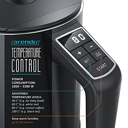 - Arendo Elegant heats the water in a short time thanks to its powerful 2200 Watts motor. The temperature is finely adjustable in 5° steps in the range from 40° to 100°. In addition, the SET button enables you to access temperatures of 40°, 60°, 80° and 100° degrees. Arendo ELEGANT uses a temperature sensor to achieve exactly the value you enter.