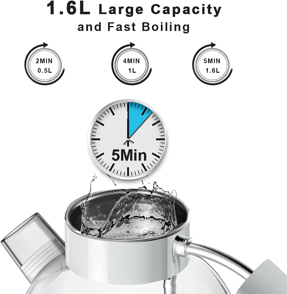 - QUICK BOILING AND SAFETY - This stainless steel electric kettle uses the concealed heating element and can boil water in 5 minutes. You can walk away to focus on other things due to the function of auto shut off and boil-dry protection.