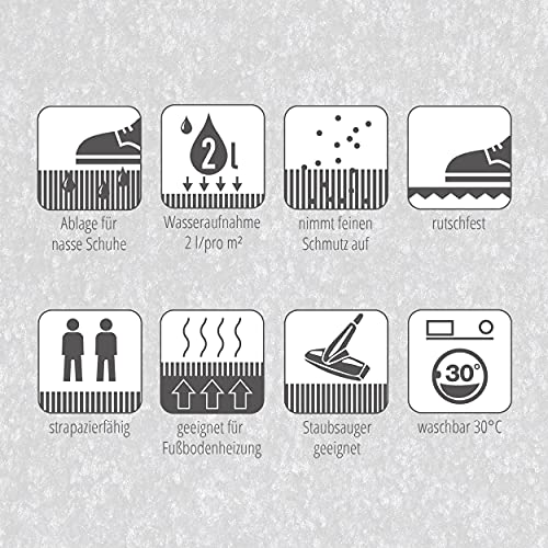 - The doormat is made from 100% polyamide and absorbs dirt and moisture with up to 2 litres of liquid per m². Even with underfloor heating, you do not need to worry because this does not affect the doormat.