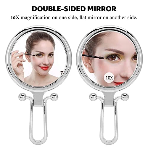 - 1/10X MAGNIFYING MIRROR: The mirror includes two sides with a 1x hand mirror and a 10x magnifying hand mirror, normal on one side and presenting magnified details with 10x on the other side.