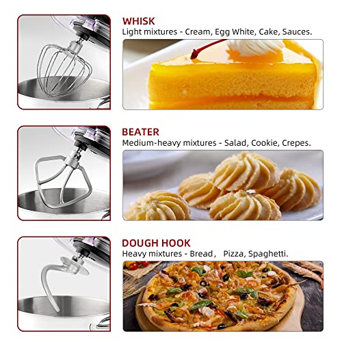 - 【6+PULSE SPEED & TILT-HEAD DESIGN】The kitchen mixer with 6-speed control access to multipurpose and a variety of recipes. Pulse can reach the highest speed in a second, used to beat egg whites. The tilt-head design mixer allows access to install or uninstall bowl and accessories easily.
