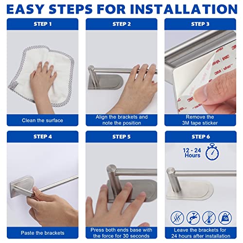Product Description We have used brushed stainless-steel rods attached with thick gauged brackets to ensure maximum quality, finishing, and strong feeling, which prevents bending or breaking of the product. The material protects against corrosion, rust, scratches, and fingerprints. This towel rail does not bend or break due to the sturdy material used, ensuring the ultimate quality. The sturdy, robust, and appealing looks make it ideal for use in your kitchen, bathroom, laundry room, bathroom fixtures, near sinks, behind the doors, etc. The 3M VHB Adhesive Tape sticks firmly to the surfaces like marble, tile, metal, glass, and solid wood. We have now provided extra 4 x self-drilling screws as well for better grip (if needed). This will allow you to use this product on multiple surfaces. Note: Not to be used above a radiator. It is pretty easy and quick to install with 3M VHB tape. You can easily install our towel rails anywhere, saving you time and energy. Made of high-grade SUS304 Stainless Steel with 18 percent chromium and 8 percent nickel, this self-adhesive brushed finish towel rail provides you with a sleek, contemporary look. Please apply only on "Recommended Surfaces" for better performance. 3M tape stickiness has some limitations, so follow proper instructions given.