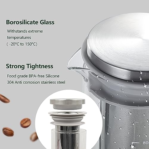 - High-Quality: Our cold brew coffee maker is crafted from premium materials to ensure durability and long-lasting use. The pot is constructed with high boron glass, capable of withstanding temperatures ranging from -20°C to 150°C. Featuring a 304 stainless steel filter, this device allows for extended brewing times and maximum flavor extraction due to its larger surface area that provides greater contact between the coffee and water.