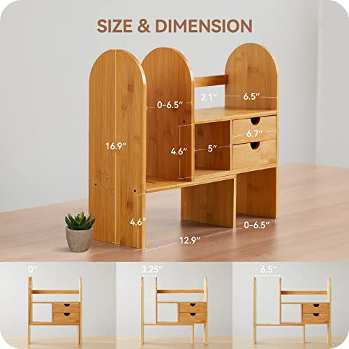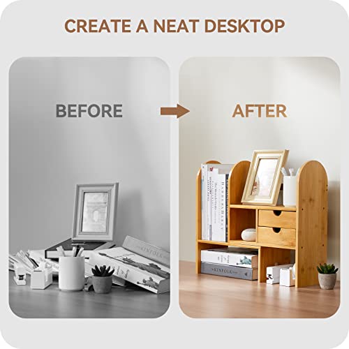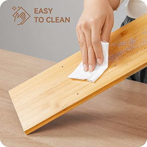 - Natural Material:Beautifully constructed from natural bamboo, this desktop shelf fits seamlessly with any decor style. The material is more environmentally friendly, non-irritating odor, non-toxic. Bamboo has a strong structure, and it is not easy to crack or deform.