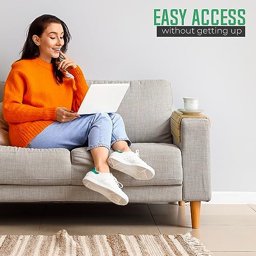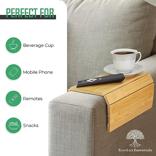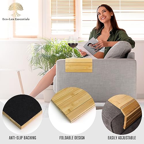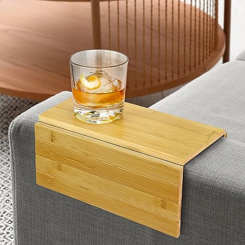 - ADJUSTABLE DESIGN: This sofa arm tray table is designed to fit on any sofa armrest, whether square or circular in shape. It can also be used on flat surfaces like a bed or sofa.