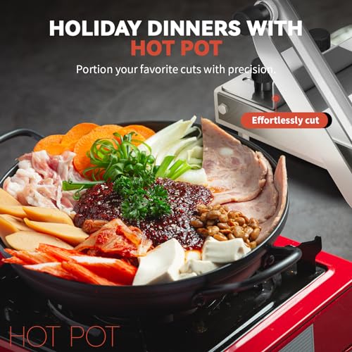 - [GOOD KITCHEN HELPER]--Made of high-quality stainless steel and equipped with an ergonomic handle, our frozen meat slicer offers smooth surface and pleasant experience. It helps you quickly slice frozen beef, meat, lamb, ham and vegetables to make hot pot, sandwiches, pizza or appetizers. It is also suitable for Korean BBQ, sukiyaki, shabu shabu, etc.