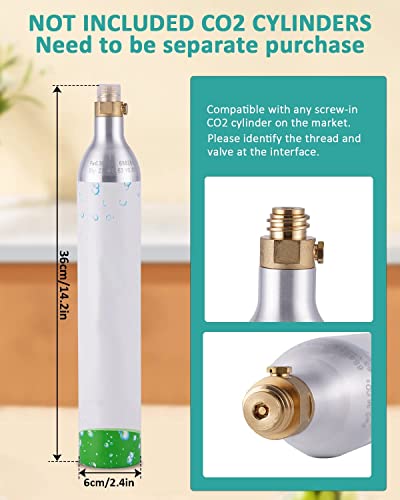 - [Package Listing]Soda maker × 1,1L water bottle × 1,0.5L water bottle × 1. Dust cover × 1. Instructions × 1. Note: The fizzy water machine is compatible with most spiral 60L CO2 cylinders on the market, It is easy to buy on the market .