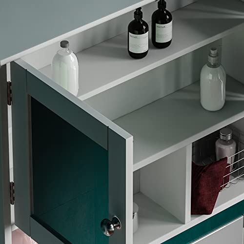 - The cabinet features a handy shelf, providing ample storage space for your bathroom essentials, from toiletries to cleaning supplies. Additionally, the three compartments below the doors offer even more storage space, ensuring that you have plenty of room to keep your bathroom tidy and organized.