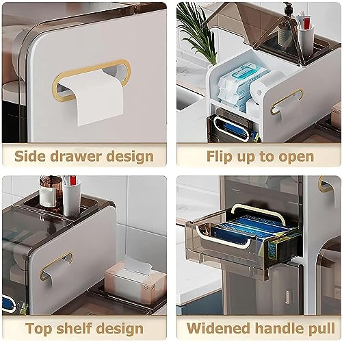 - 【Ample Storage Space】This freestanding bathroom toilet paper cabinet has all the space for storing items.Open top lid and recess for tissue,dental cups.Drawers of different heights can hold bath towels,towels,cosmetics,skin care products.The bottom heightened drawer can be specially placed for medium and large items such as laundry detergent and shampoo