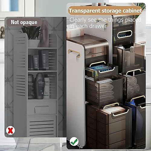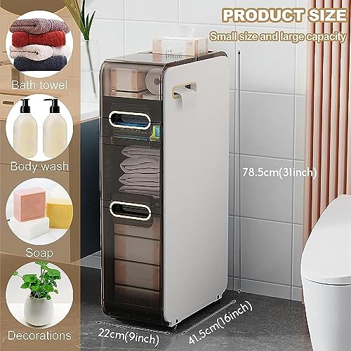 - 【Removable Slim Storage Drawer】The narrow bathroom floor cabinet adopts four raised feet,2 of which have rollers,which can be easily pulled out and pushed back,the freestanding rolling organizer is strong enough to bear heavy objects