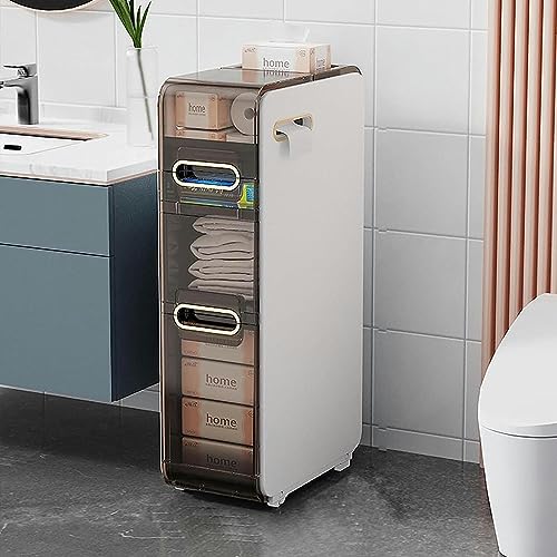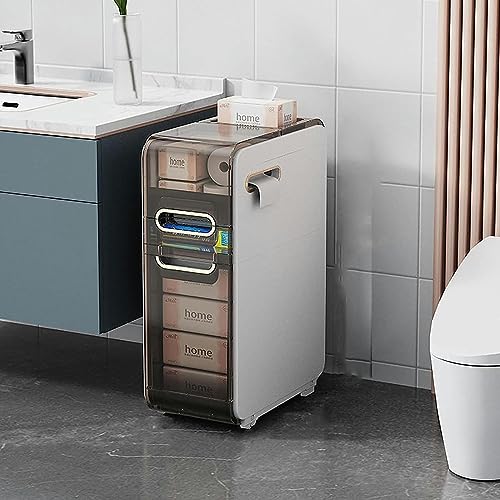 - 【Removable Slim Storage Drawer】The narrow bathroom floor cabinet adopts four raised feet,2 of which have rollers,which can be easily pulled out and pushed back,the freestanding rolling organizer is strong enough to bear heavy objects
