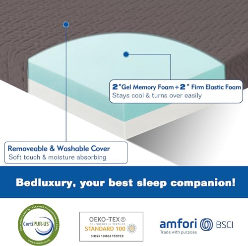 - GEL MEMORY FOAM & CERTIFICATION – Bedluxury 4inch mattress topper is CertiPUR-US certified and bamboo cover is OEKO-TEX certified. The memory foam infused with cooling gel that captures and distributes heat to improve your sleeping experience. High-density memory foam provides as much comfort and support as possible to help relieve common pressure points and prevent you from sinking into the foam