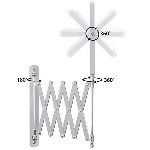 - 360° SWIVEL EXTENDABLE DESIGN: Each mirror tilts and rotates 360 degrees. The mirror can be moved towards and away from you so you can get a better view of your face. The jointed scissor arm also allows you to move the mirror left or right. All these features ensure you get the best view for your beauty needs. Once you have used your mirror, simply push it to the wall. It can be positioned flat against your wall to save storage space which makes this great for small rooms.