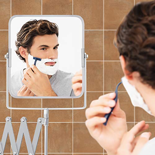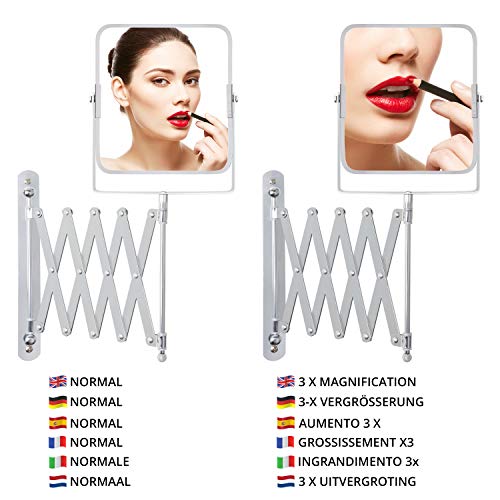 - STAINLESS STEEL VANITY MIRROR: Our wall mounted mirror rotates 360 degree and is 15.5 x 18.5cm (6.10 x 7.28 inches). One side of the mirror is 3 X magnification and the other side is a standard mirror. This mirror can be extended outwards from 10cm (3.93 inches) to a maximum of 54cm (21.25 inches). It is made from stainless steel and has a chrome finish. Each mirror comes with 2 wall plugs and 2 screws so you have everything you need to install your mirror.