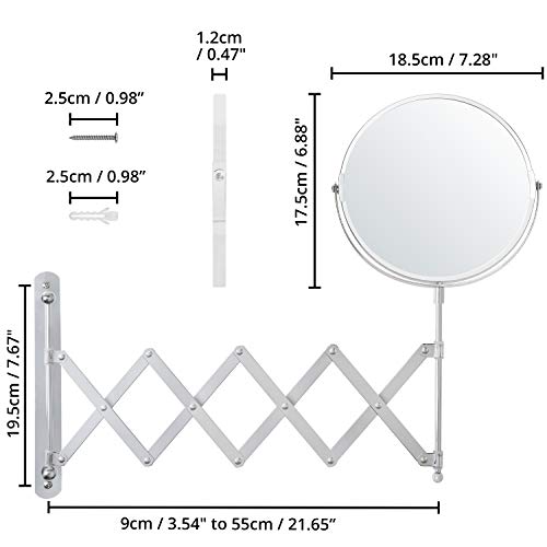 - STAINLESS STEEL VANITY MIRROR: Our wall mounted mirror rotates 360 degree and is 17.5 x 18.5cm (6.88 x 7.28 inches). One side of the mirror is 3 X magnification and the other side is a standard mirror. This mirror can be extended outwards from 9cm (3.54 inches) to a maximum of 55cm (21.65 inches). It is made from stainless steel and has a chrome finish. Each mirror comes with 2 wall plugs and 2 screws so you have everything you need to install your mirror.