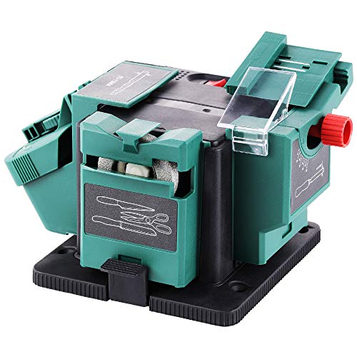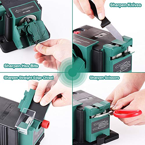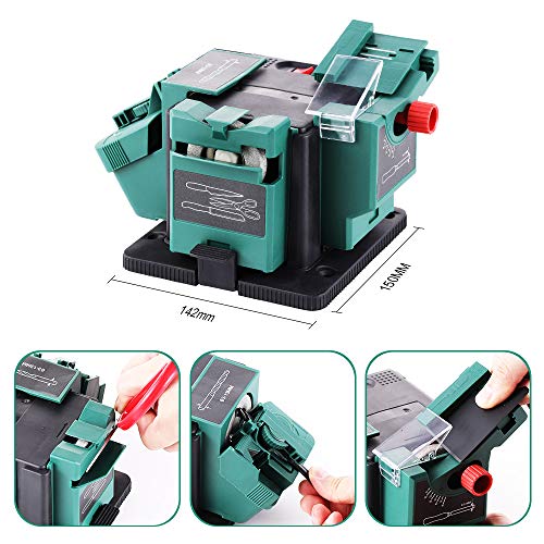 • 👍High security: Portable electric multipurpose sharpener has a compact design and is easy to store. A transparent protective cover is installed on the machine to ensure user safety.It has a sharpening groove for knives and scissors. Not only that, the machine is also equipped with a chisel guide, with a magnet and a V-shaped guide, for precise grinding of the drill.