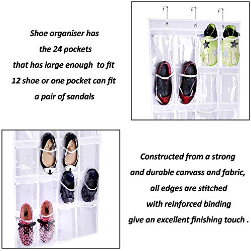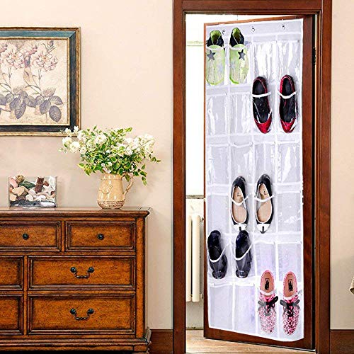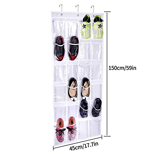 - Enough Capacity: This Shoe Hanger with 24 clear pockets and adjustable metal door hooks suspends shoes on closet doors adding shoe storage space to any size home or dorm.