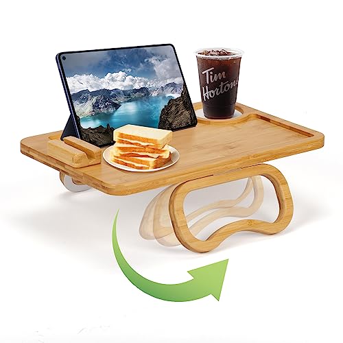 - 360°ROTATING PHONE BRACKET: Bamboo Couch Arm Tray Table with 360° rotating phone bracket can satisfy your needs for watching videos on mobile phones and IPAD from all angles, Ergonomic inclination angle allows you to enjoy your life at sofa