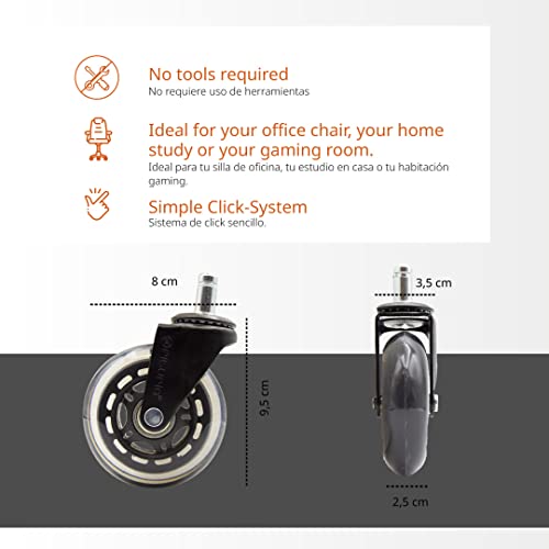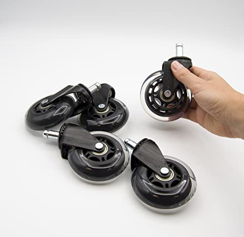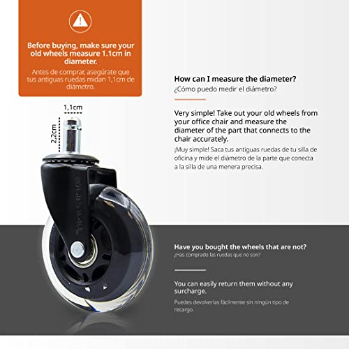 - ✅ Wheels for chairs. These wheels are 11 mm x 22 mm and are adaptable to multiple types of chairs, both gaming and office. Recommended to check your chair measurements before purchase.