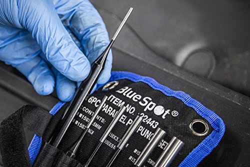 From the manufacturer Blue Spot Tools Parallel Pin Punch, Black, Set of 6 Pieces The Blue Spot Tools 6 PCE Parallel Pin Punch set is drop forged from heat-treated chrome vanadium. Ideal for the installation and removal of lock pins, spring pins and cylinder lock roll pins. Punches are 150mm in length. Complete with a handy pouch for quick and easy storage. Package Contents 2.5, 3.5, 4.5, 6, 8, 10mm
