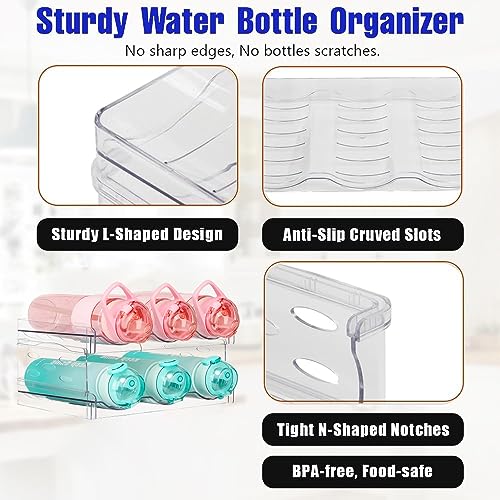 - 【Easy-to-Stack & Non-Slip Design】Our stackable water bottle organizer features non-slip stripes in each slot to prevent bottles from rolling off. Each tier can be used separately or stacked into 1 or 2 tiers to fit the perfect spot and fit for anything. Ensure minimal space usage and keep all bottles organized to avoid falling out of cabinets, fridge, counters, etc.