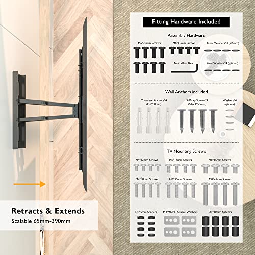 - Space Saving- This TV wall bracket 65 inch can retract down to 65mm from the wall and extend to a maximum of 390mm away from the wall, saving you valuable space. Designed to take up little space, this mount features a low profile design that's sleek and modern. Manage your wires with a 1.8m HDMI cable and 5 wire bands for a neat appearance.