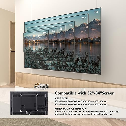 - Full Motion Adjustable & Stong Dual Arms - The arms of our TV wall bracket can swivel +/- 45° to the left and right (max swivel angle depends on TV size.), easily customizing your viewing experience. The arms of this large TV wall mount are made of high quality black coated cold rolled steel, making it extremely durable and anti-rust. It comes with two steel arms which can hold TVs weighting up to 60 kg. Safety locks ensure your TV is held securely.