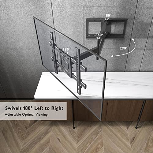 - Extra long swivel arm: Our TV wall mount can extend up to 850mm from the wall; Fully flexible: Designed with function of ±90° swivel /±8° tilt/ ±3° rotation, with 3 joints on the main arm, this universal and stable TV wall bracket is fully movable and flexible. To maximize its function and make it easy operate: This TV bracket is ideal for solving your viewing problems with the 850mm extended articulating arm, which can maximize your viewing points from a variety of angles in multiple rooms.
