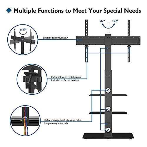 • Swivel & Height Adjustable - Mount bracket swivels left and right 37°to provide a wide-range viewing angle; 6 levels of height adjustment to meet your different TV size or seating height requirement, with three levels of height adjustment for central column, each by 4cm and two levels of height adjustment for mounting arms, each by 5mm height, can be adjusted by 50 mm