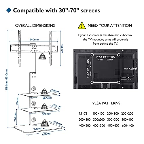 • Compatibility - This Floor TV stand with mount fits most TVs from 30" to 70" with a maximum load capacity of 40 kg (88 lbs); Compliant to VESA patterns 75x75 /100x100 /200x100/ 200x200/ 200x300/300x300/300x400/400x200/400x300/400x400/600x400; It is suitable for most TV brands on the market such as LG, Electronics, Sony, Sharp, Panasonic, Philips, Vizomax, Cello, Bush, Blaupunkt, JVC, Hitachi, Hisense, etc