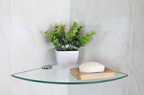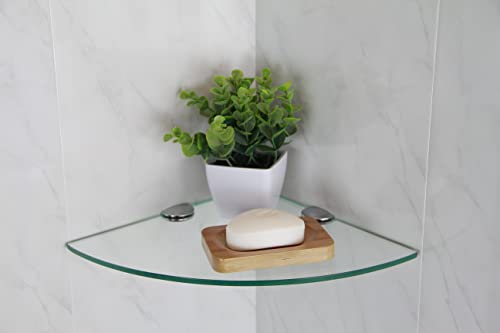 BSM Marketing 200mm (7.8") 6mm Thick Toughened Glass Corner Shelf Bathroom Bedroom Kitchen with Large Chrome Supports (Clear)