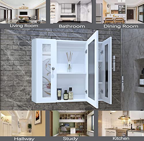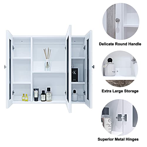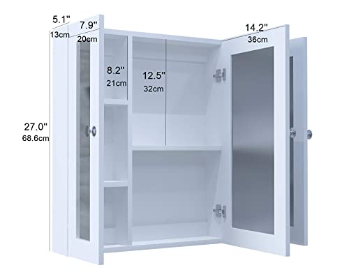 - MULTI-PURPOSE USE: With elegant white color and white color, the cabinet can be installed in different rooms such as bathroom, living room, or study. The diversified storage space can conveniently store various items, making your storage easier. Separate mirror doors can keep your privacy, different storage compartment enables you to store soap, towel, shaving cream, medicine and so on. The cabinet can be used as bathroom vanity, pharmacy cabinet and etc.
