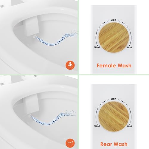- 🚿 Dual Cleaning Nozzles - BUMMS bidet toilet seat attachment offers two distinct options for enhanced hygiene. The first option is the posterior wash, ensuring a comprehensive and thorough cleansing experience. The second option is the feminine wash, thoughtfully tailored to cater to the needs of women during their menstrual cycle and providing exceptional comfort for expectant mothers.
