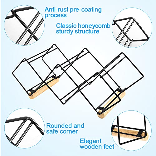 - 【COMPLETELY STURDY & NO ASSEMBLE REQUIRED】:The wine rack is made of solid metal and premium wood, the geometric design is specially designed to fix the bottles and prevent them from slipping out and breaking, which has a reliable construction.No assembly required ,you just need to take out and expand then put wine bottles on. The metal wine rack do not have any problems such as missing screw or any complex installment.