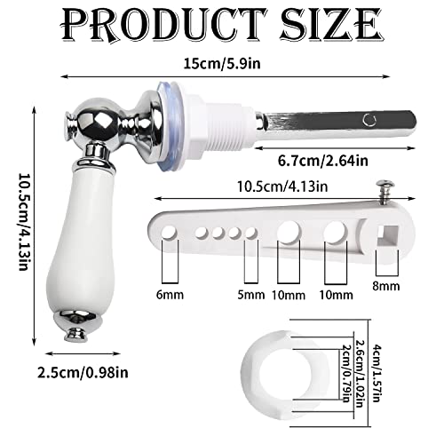 - ✾【What You Will Get】: The package of ceramic toilet flush handle includes 1 x water tank handle (length: 85mm), 1x plastic insulating sleeve (diameter: 40mm), 1x fixing nut (length: 15mm), 1x water tank lever arm (length: 105mm/rod hole diameter: 5mm/6mm/10mm).