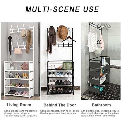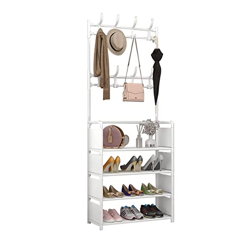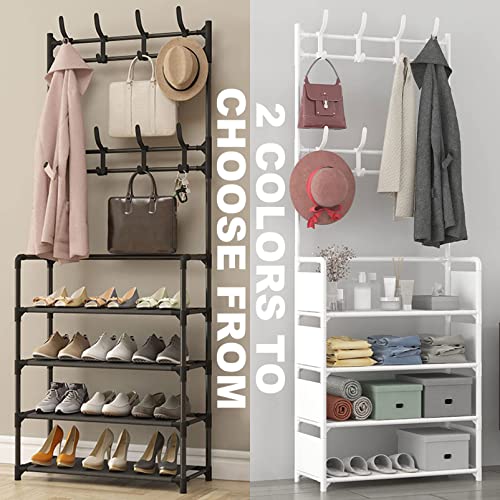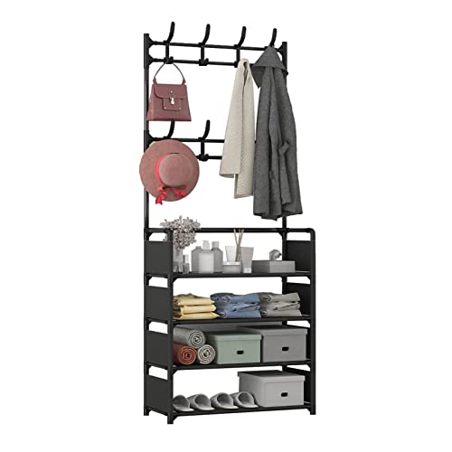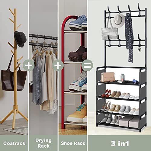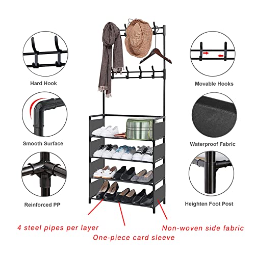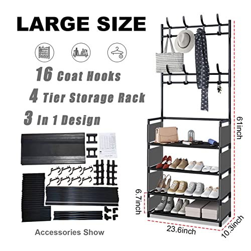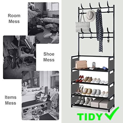 - ☺[3 IN 1 DESIGN]:Entryway hall tree is the perfect combo of coat rack and shoe storage bench, with 4 tier shoe rack and 8 moveable hooks. Convenient to receive shoes, clothes, hats, bags, scarves, umbrellas, keys, etc.Satisfy your a variety of storage demand, large capacity, space saving, concise and convenient.