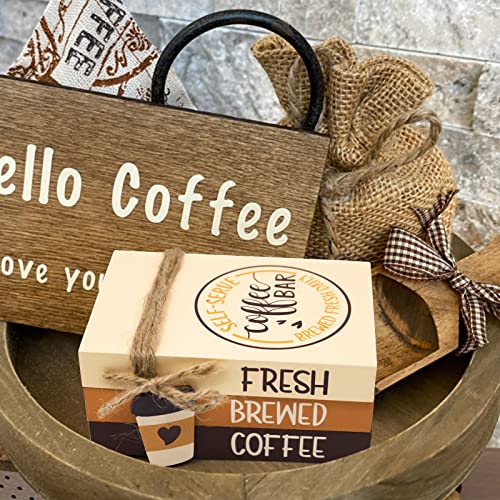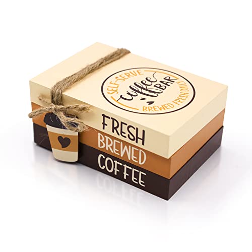 - VALUED KITS - This farmhouse coffee station book stack comes in a set of three. It reads "FRESH BREWED COFFEE". This coffee bar tiered tray decor is perfect for your tiered tray, bookshelf, coffee table, entryways, or any spot in your home that needs a vintage touch!