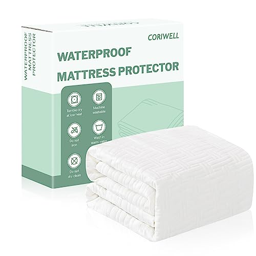 • 100% Waterproof & Noiseless - Coriwell waterproof mattress protector king size bed is lined with an upgraded and thicker waterproof TPU layer, which is noiseless and can perfectly to protect your expensive mattress from liquids, fluids, perspiration, accidental spills or stains. Keep your bed dry and without any wrinkling or plastic noise when moving, providing you with the best sleep protection. Great for those with new mothers, kids, pets, and the elderly.