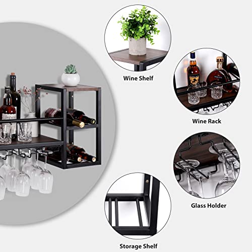 - 【Efficient Wine Storage】Wall-mounted wine rack has 3 layers, providing ample storage space. Wine rack top layer holds plants, vases and other decorative items you like. Both sides can hold about 4 bottles of wine. The middle of wine rack holds standard bottles of 0.7-1 liters of whiskey, gin, liqueur, etc. It's also equipped with a raised guardrail, which can be used to place wine and glass bottles, prevent them from falling. Liquor shelf with 3 team at the bottom, which can hold up to 6~9 glasses.