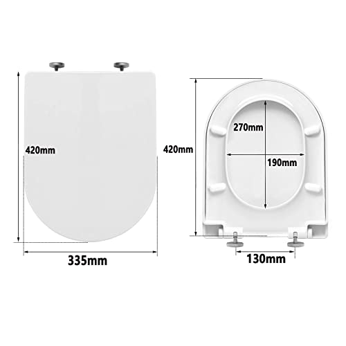 - 【Quick Release & Easy Installation】- Put both lid and seat in the vertical position on the toilet,then push the fixings into the holes of lid and seat.When you need to clean it completely or replace it,just open the lid and seat to 90 degrees and pull both upwards.No release button,but could be quick releasde,just pull out directly,even a green-hand can finish it easily.