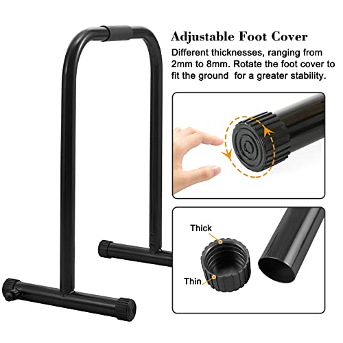 - 💪 Rubber Feet: The non-slip and adjustable feet to can adjust the dip bars stability. Because the thickness of feet is different, one side is 2mm and the other side is 8mm.