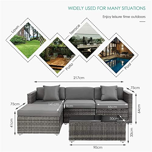 - with wide armrests, soft cushions, custom grey cushions, stylish table tops made of black glass, shine, perfectly match the grey rattan sofa and match your simple home style.