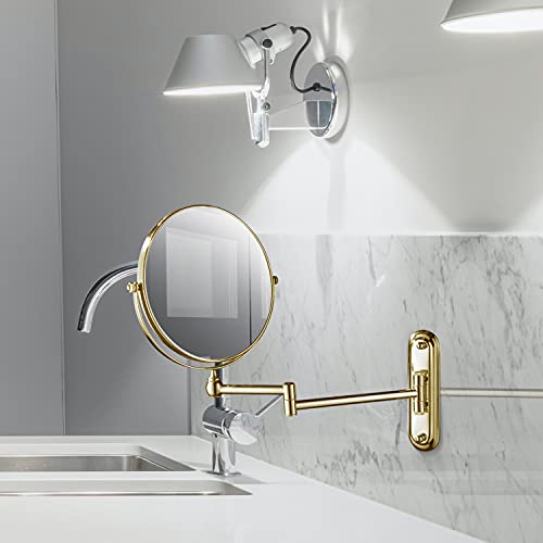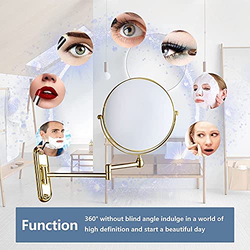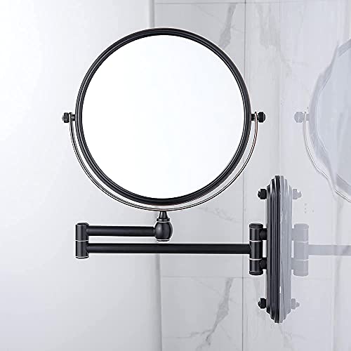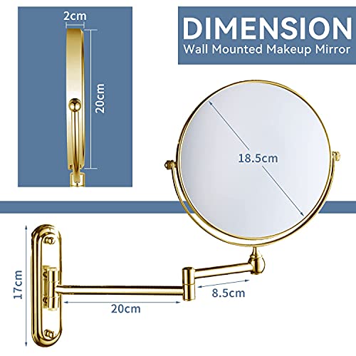- 【360°SWIVEL AND FLEXIBLE ARM AND SPACE SAVING】This is a wall mounted magnifying mirror.It is equipped with an extendable and rotatable about 11.2 inches (28.5cm) mirror arm.It's also a 360° swivel double-sided mirror.You can freely adjust the vanity mirror position and angle.When you don't need it,you can fold it up against the wall.This will save you a lot of space.The extendable magnifying mirror diameter is 20cm/7.8 inches.17cm/6.7" base.The total weight is about 950g.Sturdy and strong.