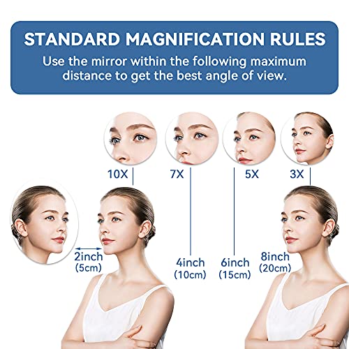 - 【CLEAR AND NATURAL MAGNIFICATION EFFECT】First of all,its magnification effect is very natural and real.No need to worry about distortion or vertigo.(Keep a distance of 10cm from the mirror for better effect)Secondly,compared to 5x or 7x magnifying mirror,this one can help you easily capture more details.That's why it allows you to do delicate stuffs like eye makeup or plucking hairs with ease.If you want to see more clearly or you don't know which magnification to choose,might as well try this.