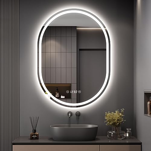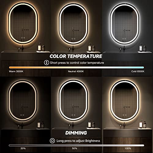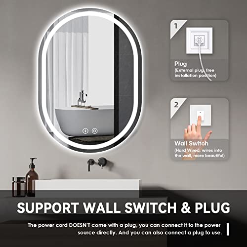 - 【Anti-Fog & IP44 Waterproof】: The oval LED bathroom mirror has a built-in defogger. When the mirror lights up, the defogger starts working to keep the makeup mirror clear. IP44 waterproof rating ensures that the mirror light can be safely illuminated in wet bathroom environments.