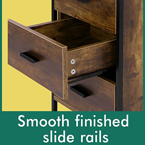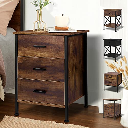 Home Bedroom Furniture ELFORDSON Rustic Brown Side Table with 3 Drawers, Metal Frame Bedside Cabinet, Sofa End Side Table for Bedroom/Living Room/Hallway