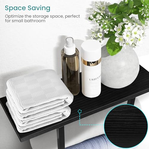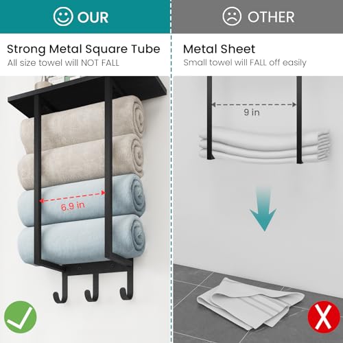 - KEEP YOUR BATHROOM ORGANIZED: Our towel rack is useful for small bathroom with limited space to maximize space savings. Roll up your towels and store them together, or you can put them on wooden shelf or towel hooks depending on your needs. A great & attractive way to store all sizes of towels